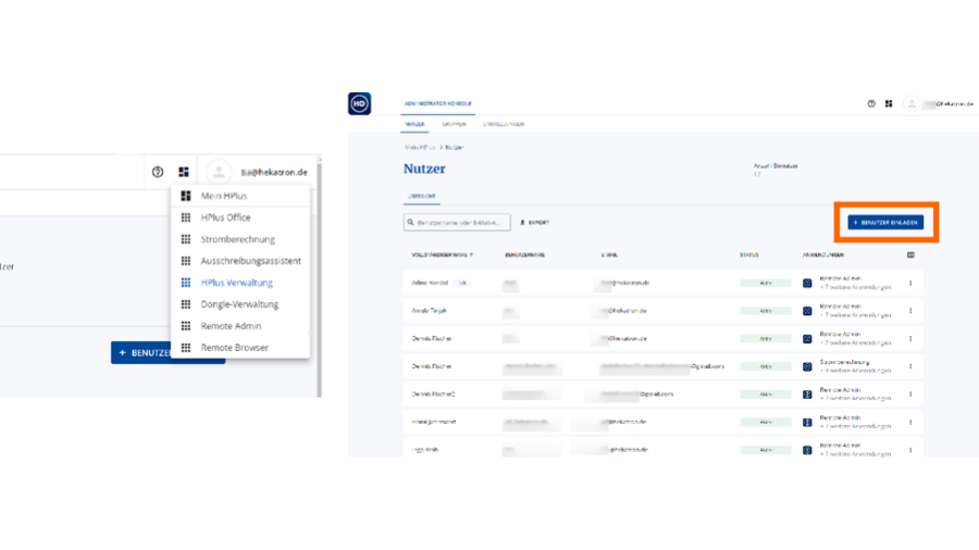 Über das Anwendungsmenü kann der Administrator die HPlus Verwaltung aufrufen und Benutzer mühelos managen - von der Einladung neuer Nutzer bis zu deren Entfernung. Nachdem Sie in der HPlus Verwaltung Benutzer angelegt und ihnen Benutzergruppen zugewiesen haben, müssen Sie ihnen in der jeweiligen Anwendung (z.B. HPlus Office) die passenden Rollen zuweisen.