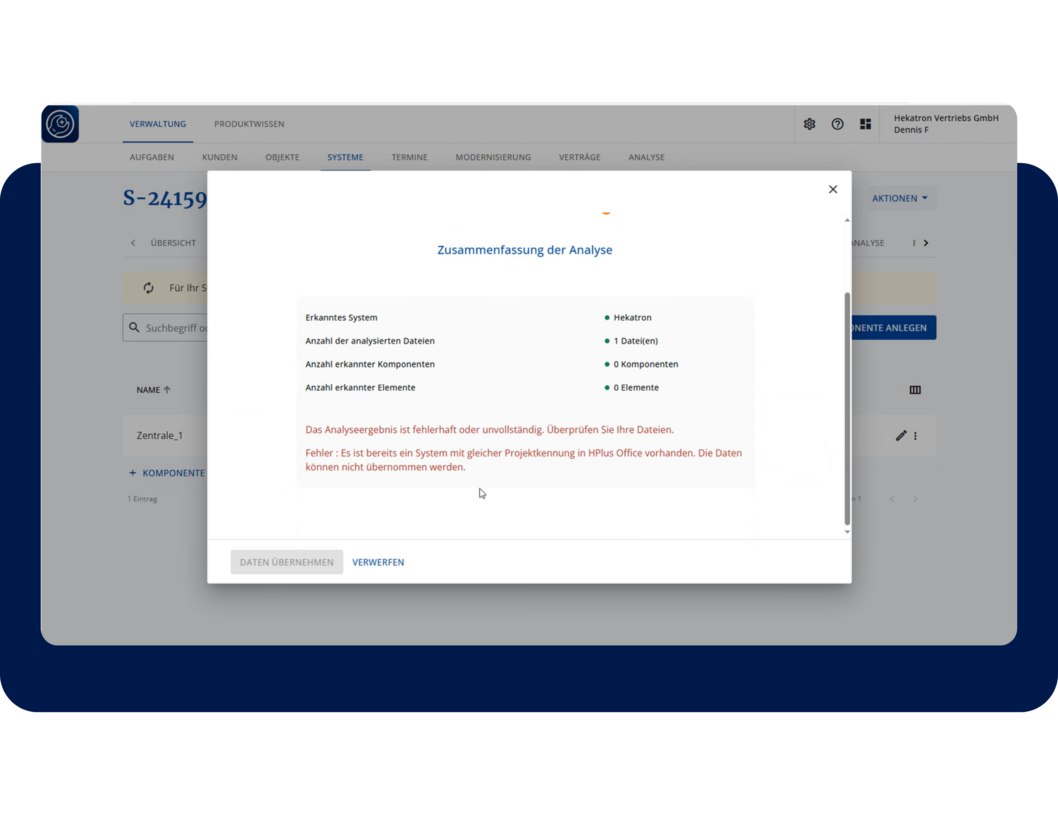 Um die Datenqualität weiter zu verbessern, prüft HPlus Office beim Hochladen von Programmierungen für Integral Anlagen nun automatisch, ob bereits ein System mit derselben Projektkennung existiert. Nur wenn keine doppelte Kennung vorliegt, kann die Programmierung übernommen werden. So wird sichergestellt, dass bei der Wiederverwendung bestehender Projekte – etwa per Copy & Paste – alle relevanten Parameter angepasst wurden.