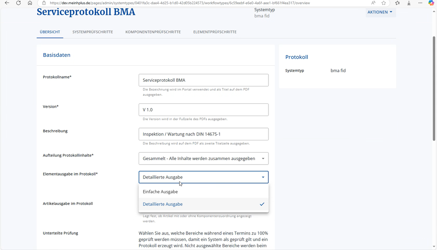 Mit dem neuen Feature zur kompakten Elementausgabe lassen sich Prüfprotokolle jetzt deutlich übersichtlicher gestalten. Statt einer langen Liste aller Elemente kann die Darstellung auf eine kompakte Form reduziert werden. Diese Einstellung wird einmalig durch einen Administrator an der jeweiligen Protokollvorlage vorgenommen – ganz einfach über: