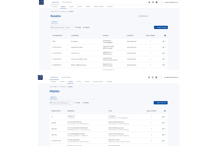 Mit der Verwaltung in HPlus Office haben Sie jederzeit die volle Übersicht über alle Kunden-, Objekt- und Anlagedaten. Steigen Sie bis auf die Systemebene ab und verwalten Sie Ihre Objekte oder teilen Sie Techniker für Einsätze beim Kunden ein - für Rauchwarnmelder- und große Brandmelde- sowie Feststellanlagen-Objekte.