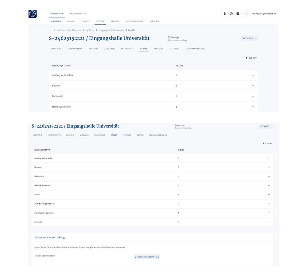 Mit HPlus Office haben Sie jederzeit einen transparenten Überblick über alle relevanten Dokumente wie Protokolle, Prüfberichte, Zertifikate, Brandschutzdokumentationen und mehr. Diese Unterlagen finden Sie zentral im Reiter „Dateien“ direkt im jeweiligen System.