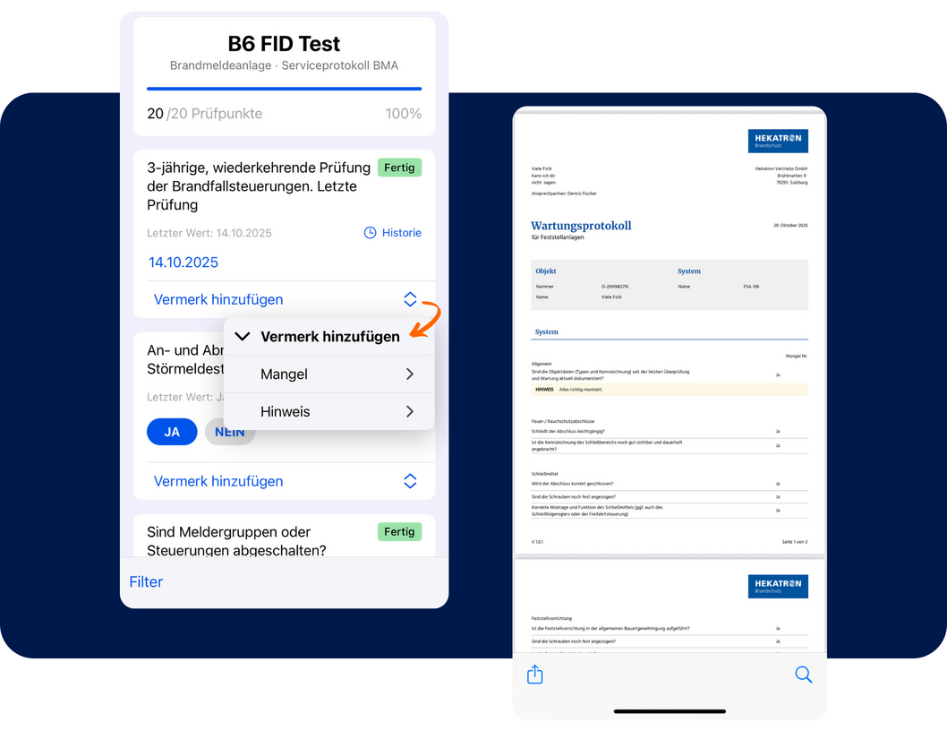 In einem Prüfschritt können jetzt einmalige Hinweise hinterlegt werden. Diese erscheinen im Protokoll, erzeugen aber keine Aufgabe und werden nicht für Folgeprüfungen übernommen – ideal zur Dokumentation ohne Folgewirkung.